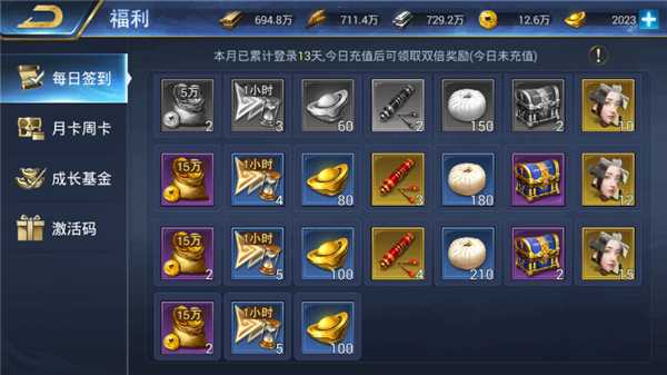 每日签到奖励丰厚,精神、实力、银锭样样俱全。高级将领名册允许主人招募更多的猛将,赢得更多的城市。每月累计登录,可按一个月内登录天数领取累计登录奖励。注意当天的奖励必须当天领取,过期不能领取。好消息是每天充值后,当天的签到奖励可以翻倍。如果玩家收到奖励后再充值,还可以补足未收到的充值双倍奖励。