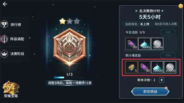 在最基础的竞技游戏中,每天有五次竞技机会,每次胜利和晋级都会获得物品奖励。目前阶段分为铁-铜-银-金-紫-金-蓝宝石-红宝石-金刚石。